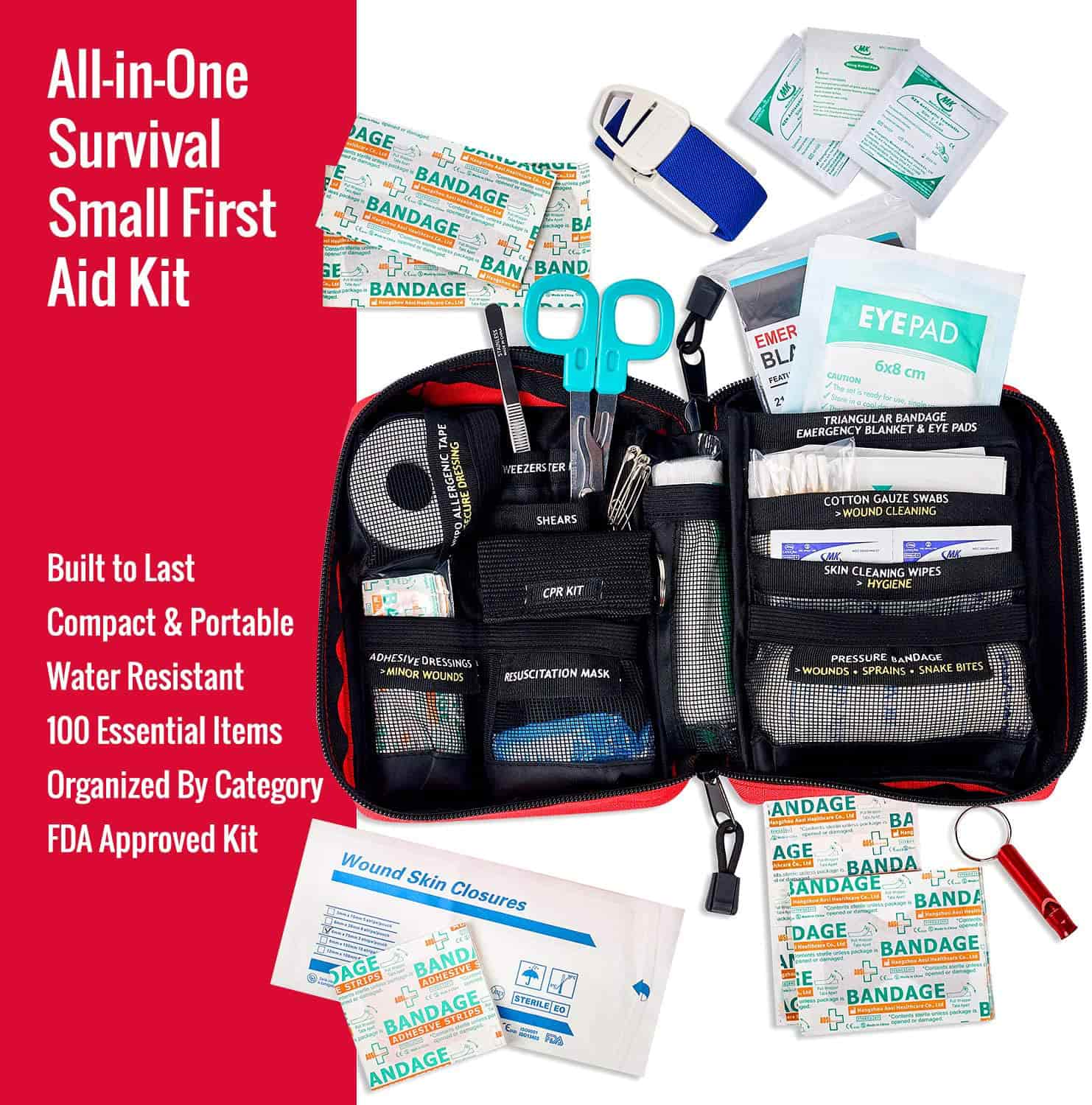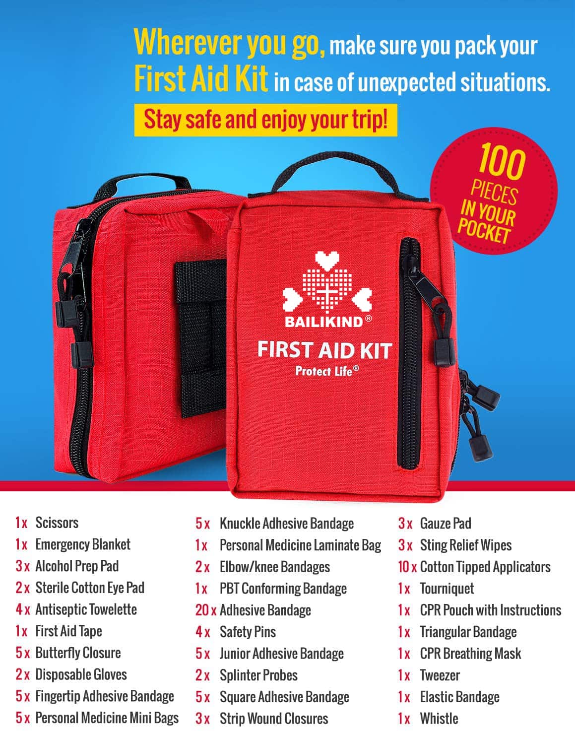 PERTSONALIZATUA larrialdietarako hornikuntza eta tresnekin lesio ugariei aurre egiteko. FSA Hautagarria den Lehen Laguntzarako botikina da eta gure lehen laguntzako botikina osatuenetako bat da, mediku eta prestatzeko elementuen aukeraketa ezin hobea izateagatik (100 pcs). Lasai izango duzu zure kita behar duzun guztiaz beteta dagoela jakitean.