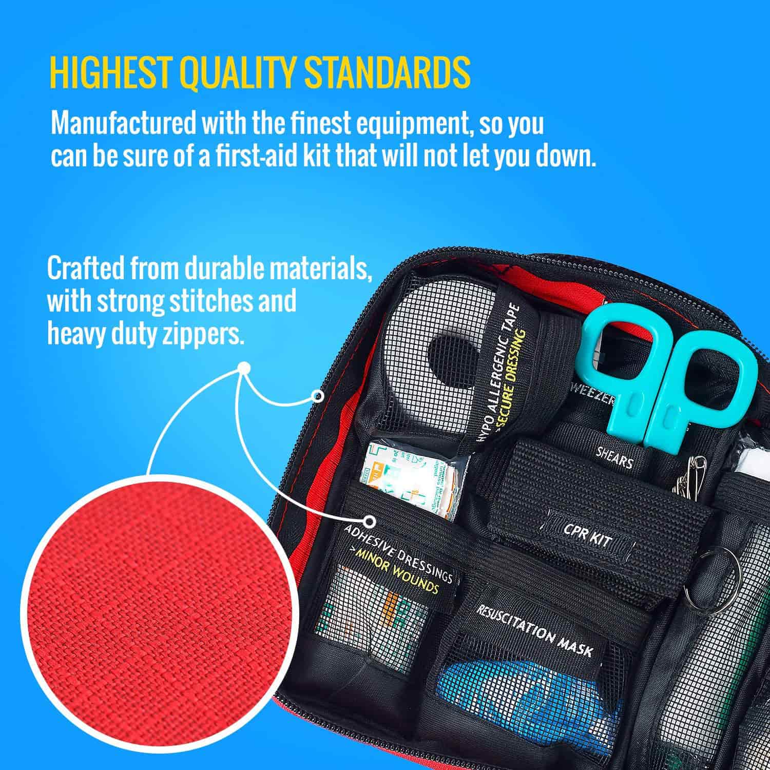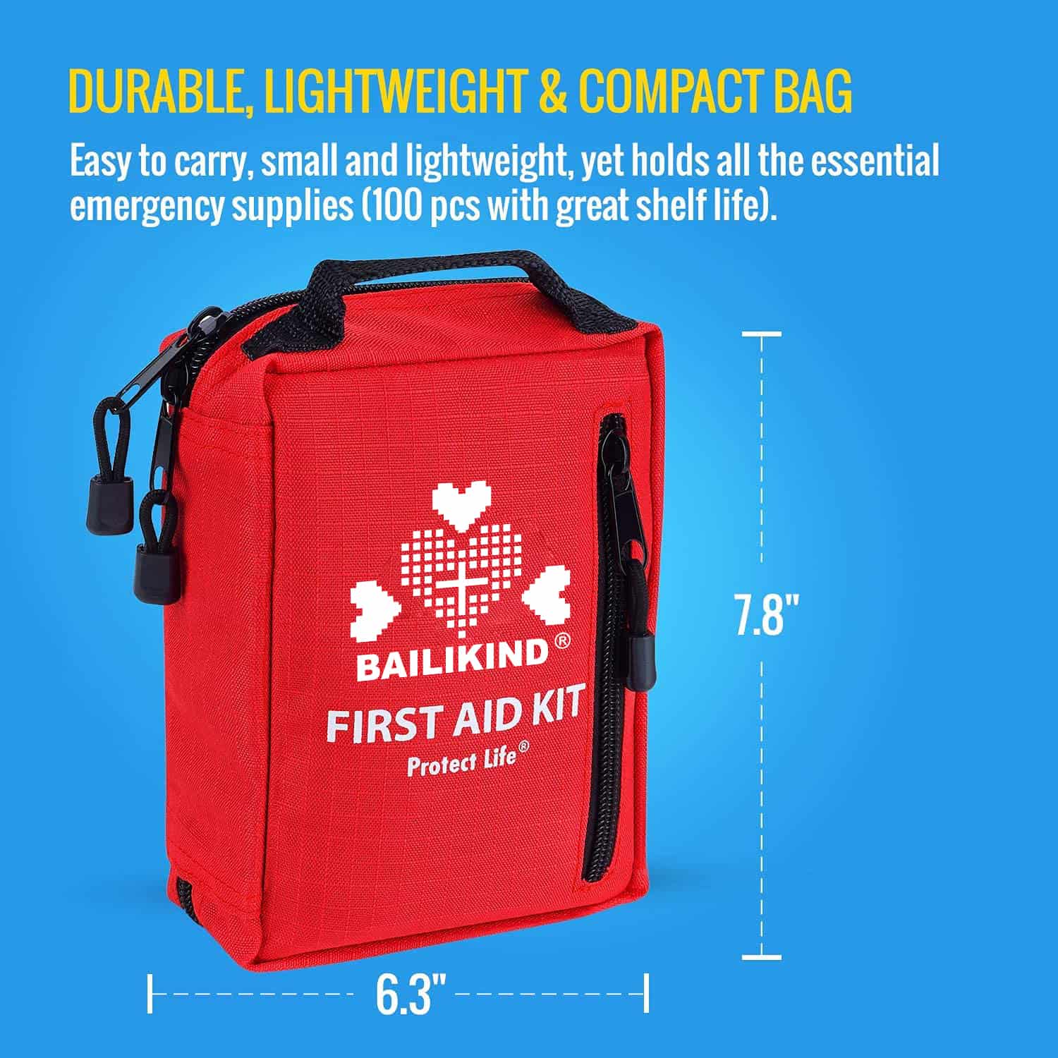 POLTSA GOGORRA ETA TRINKOA IZATEKO DISEINUA (7,8 x 6,3 x 2,7 hazbete, 1,02 kilo baino ez ditu pisatzen), larrialdietarako botikina 600D ripstop poliesterraz eta kremailera sendoz egina dago. Eramateko erraza da eta tamaina egokia du, zure etxeko medikuntza-armairuan, unibertsitateko logelan, akatsen poltsan, kotxean, autokarabanatan gordetzeko, bizikleta edo motozikleta bati lotzeko.