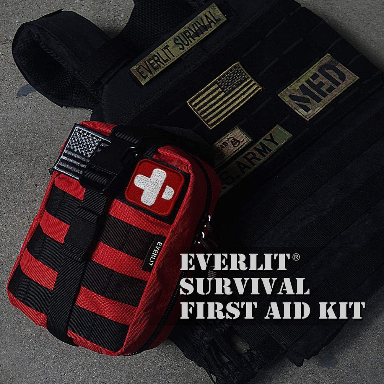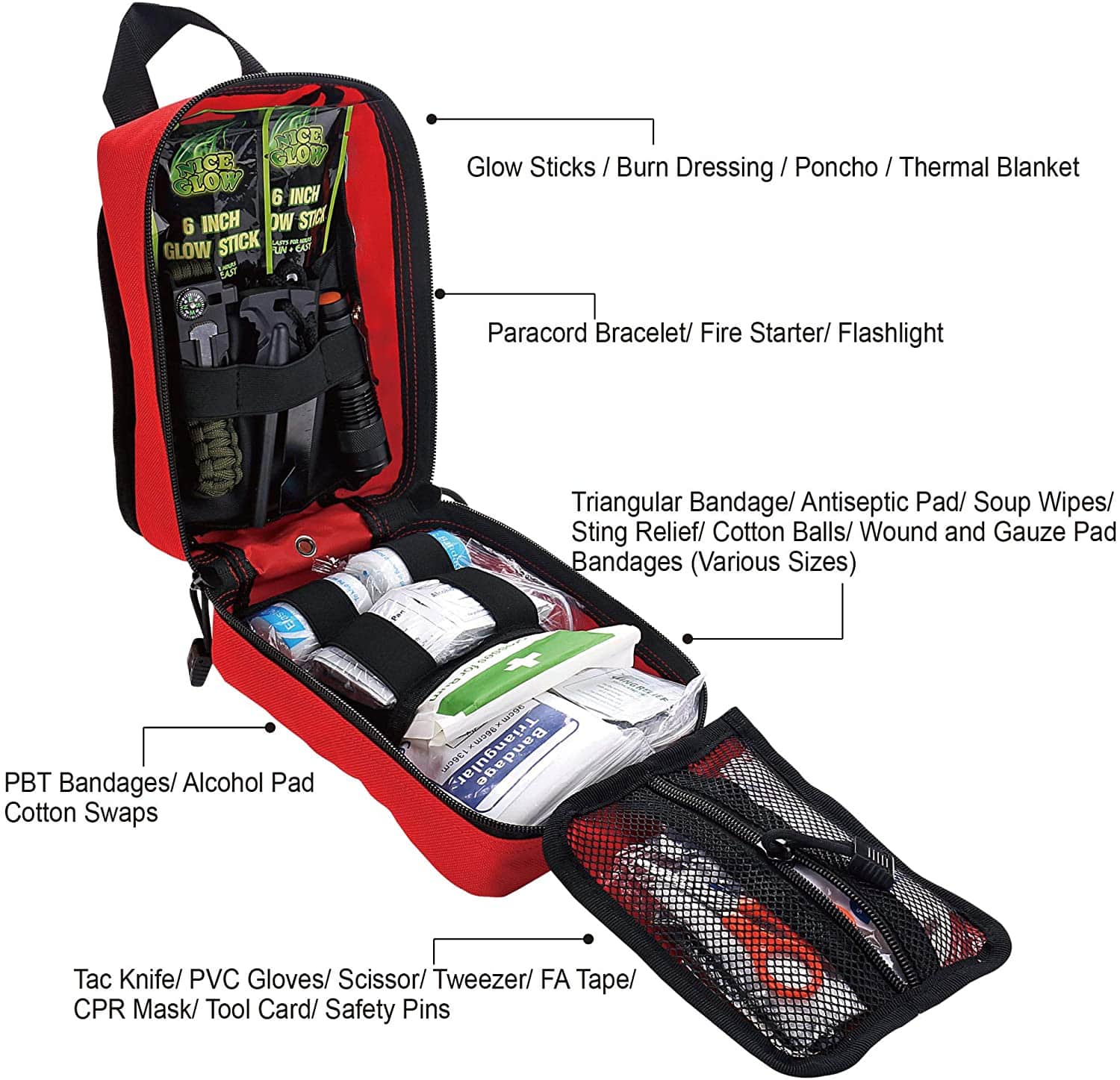 Red Survival Lehen Laguntzako botikaren ezaugarriak 250 piezako lehen laguntzak ditu: maila militarreko EMT poltsa urarekiko erresistentea den 1000D nylonez egina zegoen, hiru konpartimentu handi eta gela ugari eskaintzen ditu zure ekipamendua gehitzeko. Kitaren dimentsio orokorra 8" x 6,5" x 5" da eta 1,9 lb baino ez du pisua. Atzealdeko molle-rekin bateragarriak diren uhalei esker, erabiltzaileak beste poltsa batzuetara edo gerrikoetara lotzeko aukera ematen du, kanpoko edozein jardueretarako lagun ezin hobea bihurtuz.